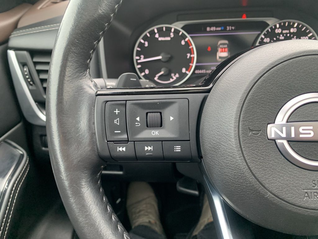 Clean CARFAX. Certified. Nissan Certified Certified, AWD, Black High Gloss Exterior Mirror Caps, Heated Driver & Front Passenger Seats, Midnight Edition Package, Panoramic Moonroof, TailorFit Leatherette Seat Trim, Wheels: 18" Gloss Black Painted Alloy, 18" Aluminum Alloy Wheels, 4-Wheel Disc Brakes, 5.604 Axle Ratio, 6 Speakers, ABS brakes, Air Conditioning, Alloy wheels, AM/FM Radio, AM/FM radio: SiriusXM, Auto High-beam Headlights, Automatic temperature control, Black Splash Guards (Set of 4), Brake assist, Bumpers: body-color, Delay-off headlights, Driver door bin, Driver vanity mirror, Dual front impact airbags, Dual front side impact airbags, Electronic Stability Control, Emergency communication system: NissanConnect Services, Four wheel independent suspension, Front anti-roll bar, Front Bucket Seats, Front Center Armrest, Front dual zone A/C, Front reading lights, Fully automatic headlights, Heated door mirrors, Heated Leather Wrapped Steering Wheel, Illuminated entry, Knee airbag, Leatherette Door Trim Inserts w/Stitch, Low tire pressure warning, NissanConnect featuring Apple CarPlay and Android Auto, Occupant sensing airbag, Outside temperature display, Overhead airbag, Overhead console, Panic alarm, Passenger door bin, Passenger vanity mirror, Power door mirrors, Power Drivers Seat, Power Liftgate, Power steering, Power windows, PRIMATEX Leatherette Seat Trim, Radio data system, Rear anti-roll bar, Rear Door Sunshades, Rear Parking Sensors, Rear Personal Lights, Rear seat center armrest, Rear side impact airbag, Rear window defroster, Rear window wiper, Remote keyless entry, Security Alarm, Speed control, Speed-Sensitive Wipers, Split folding rear seat, Spoiler, Steering wheel mounted audio controls, SV Premium B Package, Tachometer, Telescoping steering wheel, Tilt steering wheel, Traction control, Trip computer, Variably intermittent wipers, AWD, Black High Gloss Exterior Mirror Caps, Heated Driver & Front Passenger Seats, Midnight Edition Package, Panoramic Moonroof, TailorFit Leatherette Seat Trim, Wheels: 18" Gloss Black Painted Alloy. 28/35 City/Highway MPG